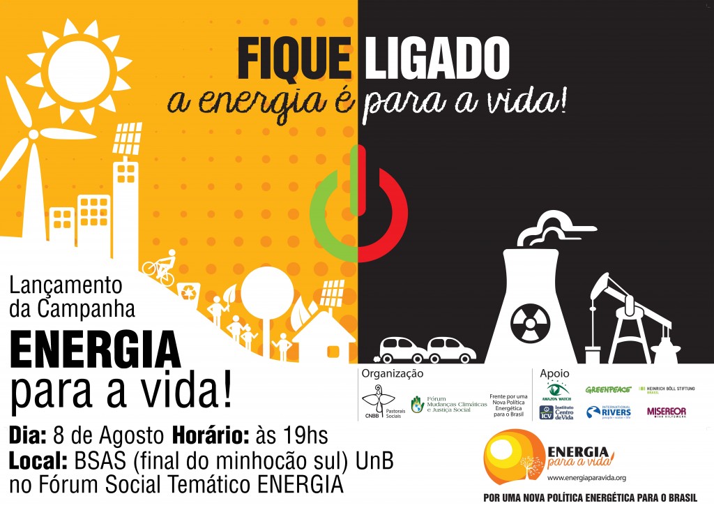 Durante o evento foi lançada “campanha aguas para a vida” e a denuncia para que o governo federal preencha AS VAGAS DA REPRESENTACAO DA SOCIEDADE CIVIL NO CNPE- CONSELHO NACIONAL DEPOLITICAS ENERGETICA – onGS E UNIVERSIDADE. Esta sendo feita campanha onde é possível assinar uma petição a favor de novas fontes energéticas, que será encaminhado aos candidatos à presidência. Ainda no hotsite do evento , é possível também assistir um vídeo que mostra a realidade da política energética brasileira, além de mostrar novos modelos de produção de energia. Por fim, também está disponível NO SITE: http://fst-energia.org/noticias/entidades-lancam-campanha-energia-para-a-vida/cartaz mural e panfletos contendo os objetivos e razões da campanha.