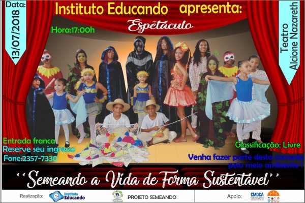 Instituto Socioassistencial Educando promove no próximo dia 13 de julho, no Teatro Alcione Nazareth, às 17, um espetáculo teatral que promove o encerramento do projeto “Semeando Consciência Ambiental através da Cultura”. A instituição é parceira do Fonasc.CBH no Comitê Infanto Juvenil da Bacia Hidrográfica do Rio Jeniparana.