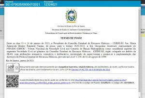 A posse ocorreu entre os dias 13 e 14 de janeiro de 2021 pelas mãos da Presidente do CERHI-RJ Sra. Maria Aparecida Borges Pimentel Vargas para o triênio 2020-2023. Entre as atribuições da vaga está a de supervisionar e promover a implementação das diretrizes da Política Estadual de Recursos Hídricos.