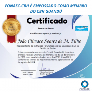 Em documento, o FONASC-CBH, representado pelo coordenador nacional João Clímaco, é empossado como membro do Comitê Guandu durante a primeira reunião ordinária do plenário, ocorrida no último dia 25 de fevereiro.