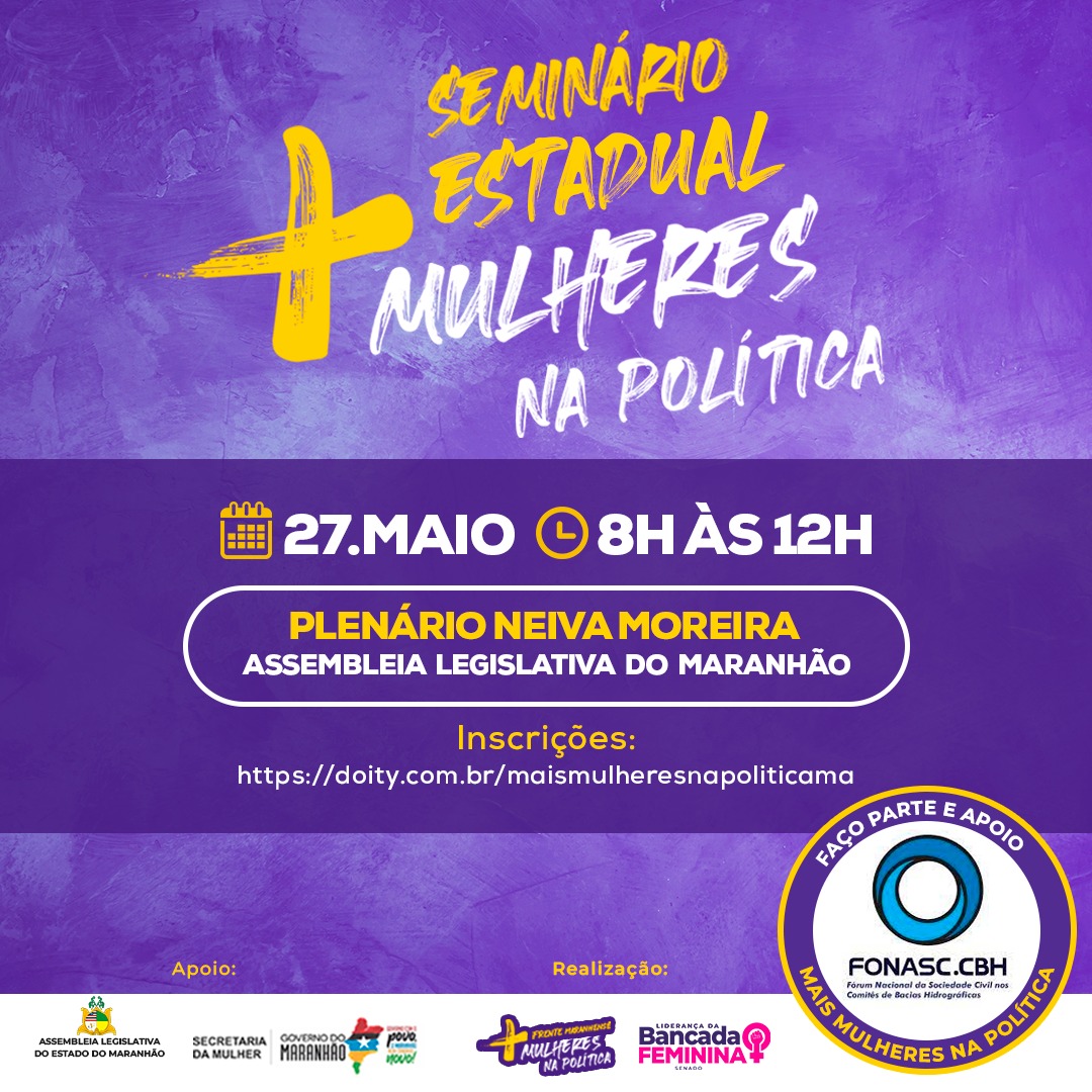 O Fonasc.CBH como integrante da Frente Maranhense + Mulheres na Política, estará no Seminário Estadual de nome homônico, que acontece no dia 27 de maio, sexta-feira, de 8h às 12h, na plenária Neiva Moreira, Assembleia Legislativa do Maranhão,