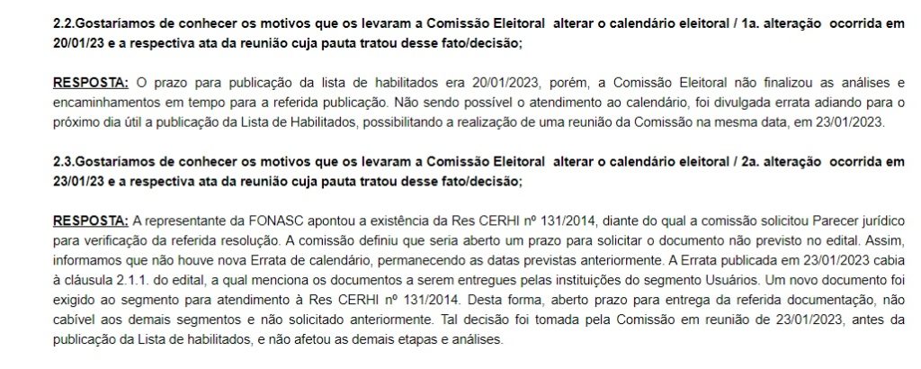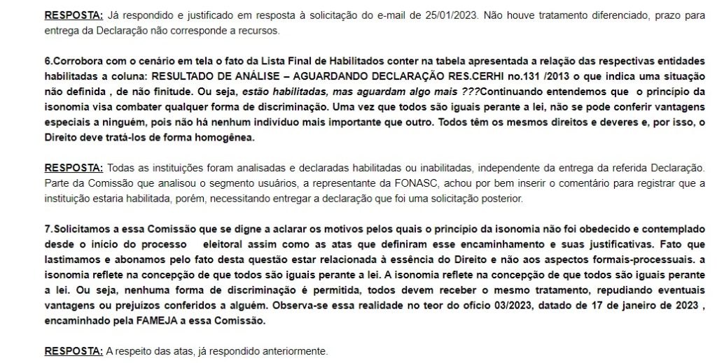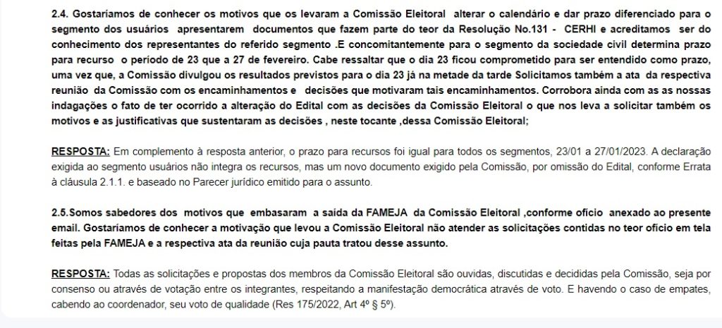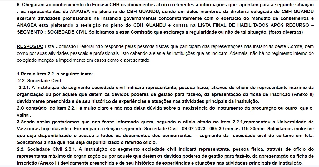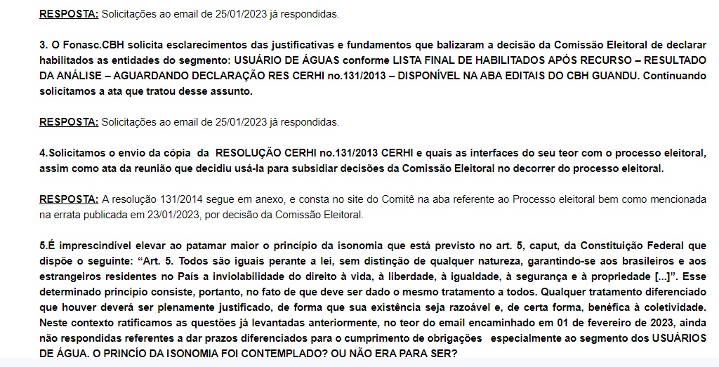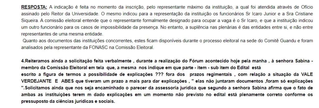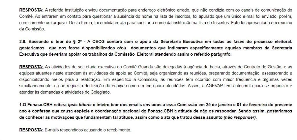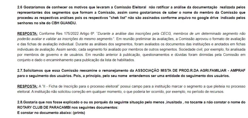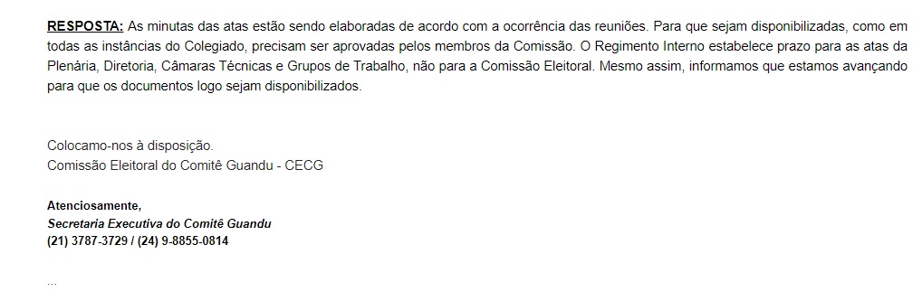 Resposta da Comissão Eleitoral do Comitê Guandu RJ