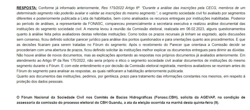 Veja abaixo a resposta recebida do Comitê Guandu RJ e em seguida a comunicação feita pelo Fonasc.CBH, aceita pelo CAO do RJ.