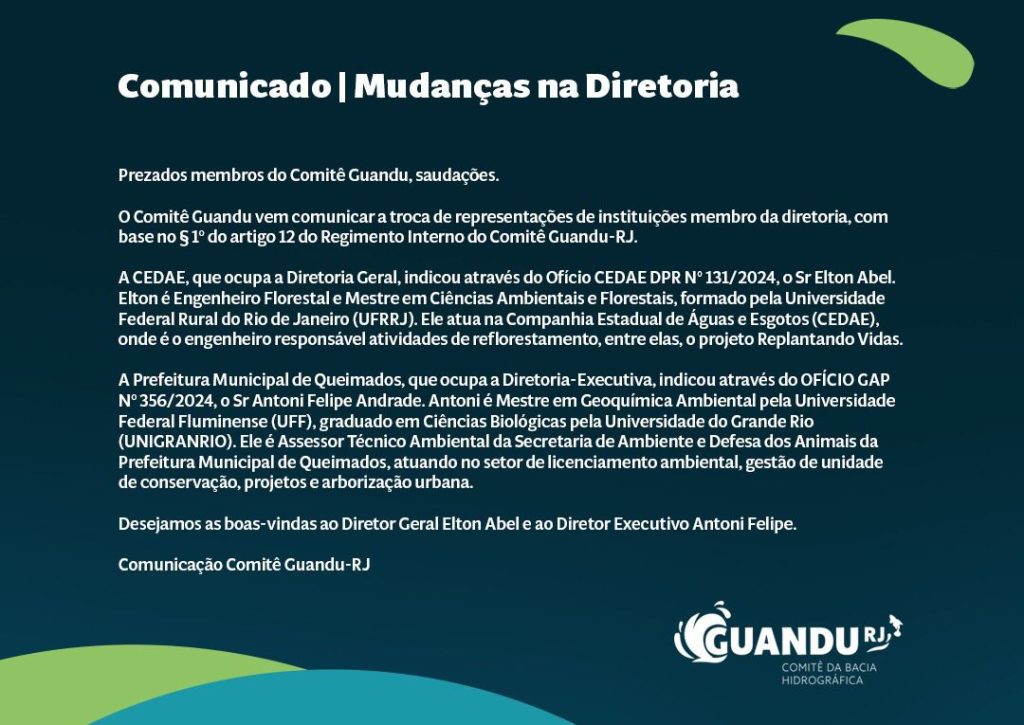 Em comunicado aos conselheiros do Comitê, o CBH Guandu informou sobre os novos representantes da diretoria. Imagem: Reprodução / CBH Guandu.