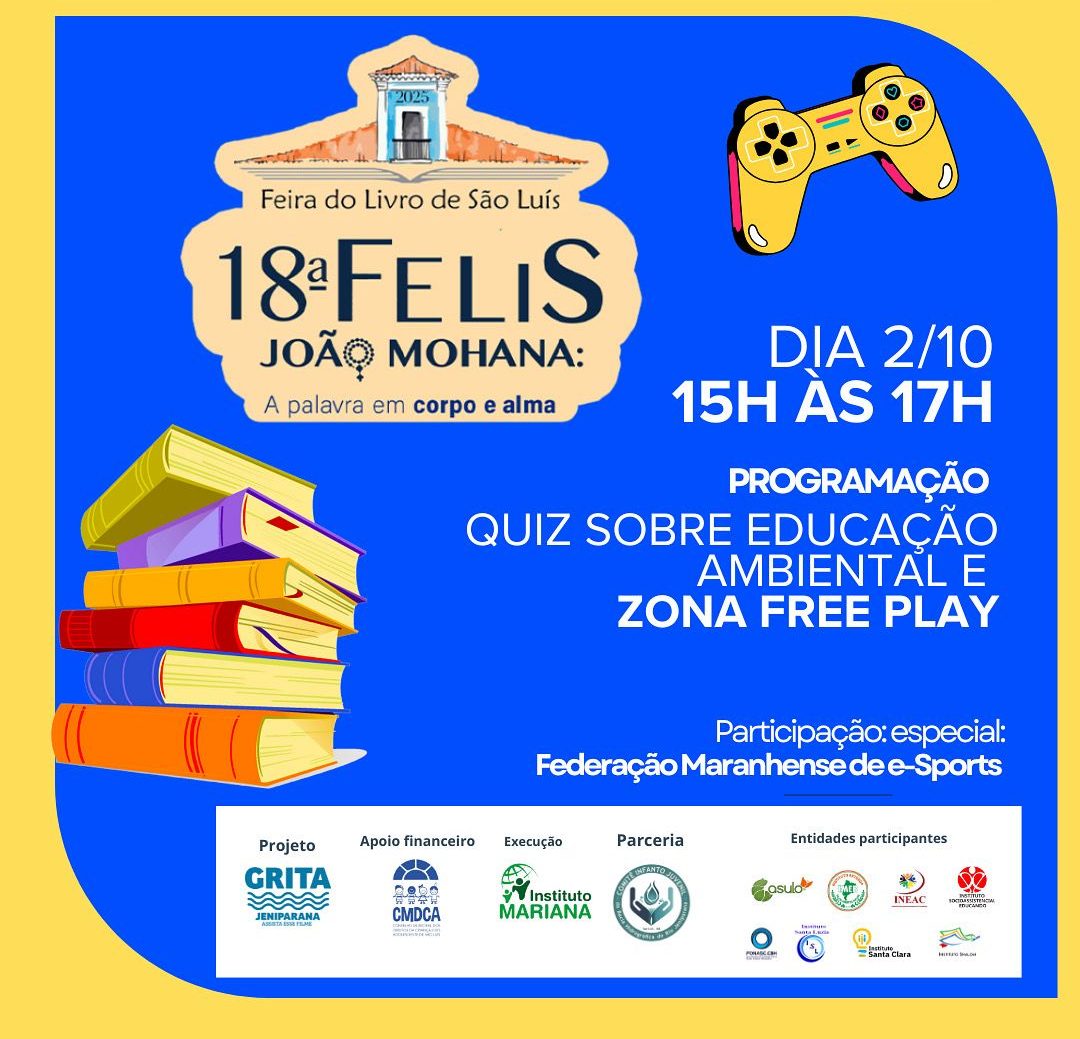 Nesta quinta-feira (2), o Projeto “Grita Jeniparana: assista esse filme”, ação que tem o apoio do Conselho Municipal dos Direitos da Criança e do Adolescente (CMDCA), execução do Instituto Mariano e parceria do Fórum Nacional da Sociedade Civil nos Comitês de Bacias Hidrográficas (Fonasc.CBH) e das escolas comunitárias do Comitê Infantojuvenil da Bacia Hidrográfica do Rio Jeniparana (CIJBHRJ), estarão no estande da CMDCA, na 18ª Feira do Livro de São Luís. A presença do projeto terá uma atividade inédita que será a participação da Federação Maranhense de Esportes Eletrônicos, E-Sports (FMES), que farão com as crianças Quiz sobre Educação Ambiental e organizarão uma Zona Free Play.