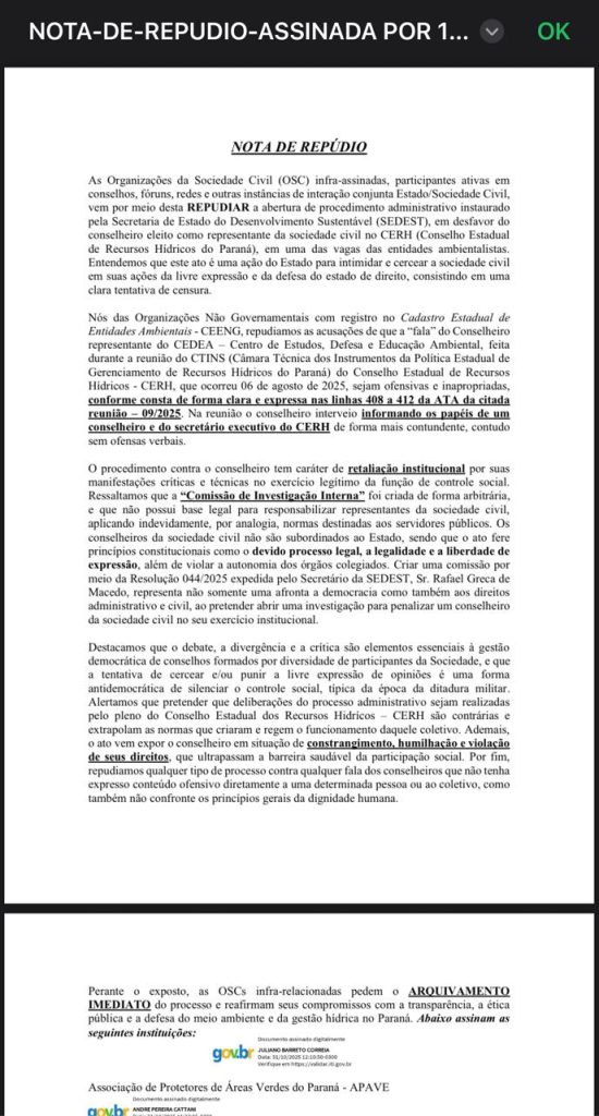 O documento manifesta repúdio à abertura de procedimento administrativo instaurado pela Secretaria de Estado do Desenvolvimento Sustentável do Paraná (SEDEST-PR) contra um conselheiro representante da sociedade civil no Conselho Estadual de Recursos Hídricos (CERH-PR), em um contexto que vem sendo interpretado como tentativa de intimidação e censura.