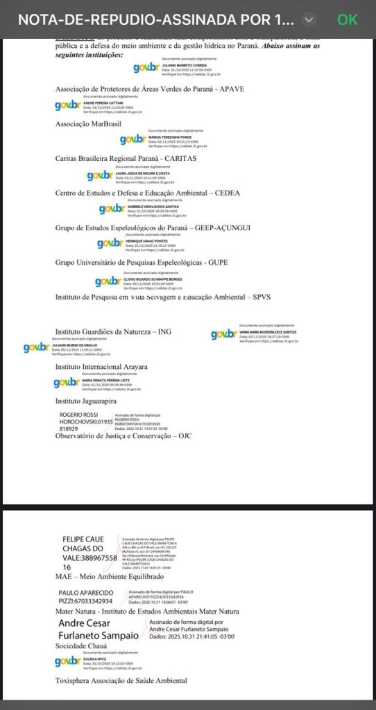 “Não é a primeira vez que isso ocorre. O próprio Estado do Paraná já vivenciou, em 2023, processos de exclusão no Conselho Estadual de Recursos Hídricos, em função da atuação crítica de conselheiros que questionaram condutas que feriam os princípios da legalidade”, acrescenta.